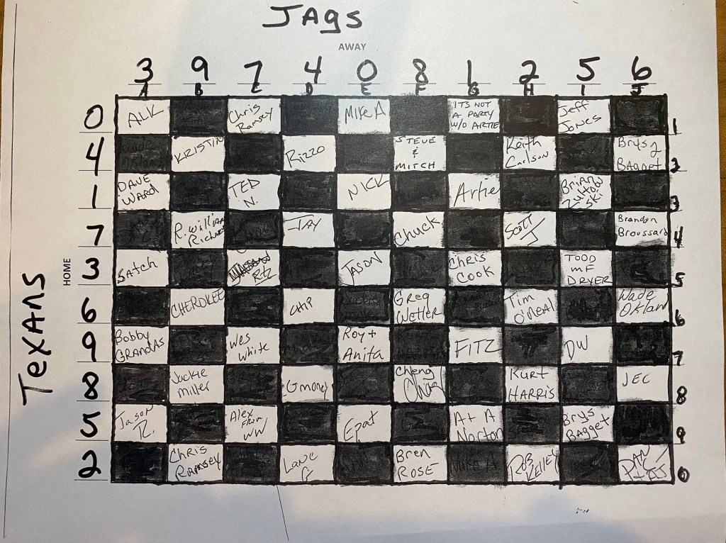 Jaguars 20 vs. Texans 24 – another rollover again- 4 boxes of ziti in play next week