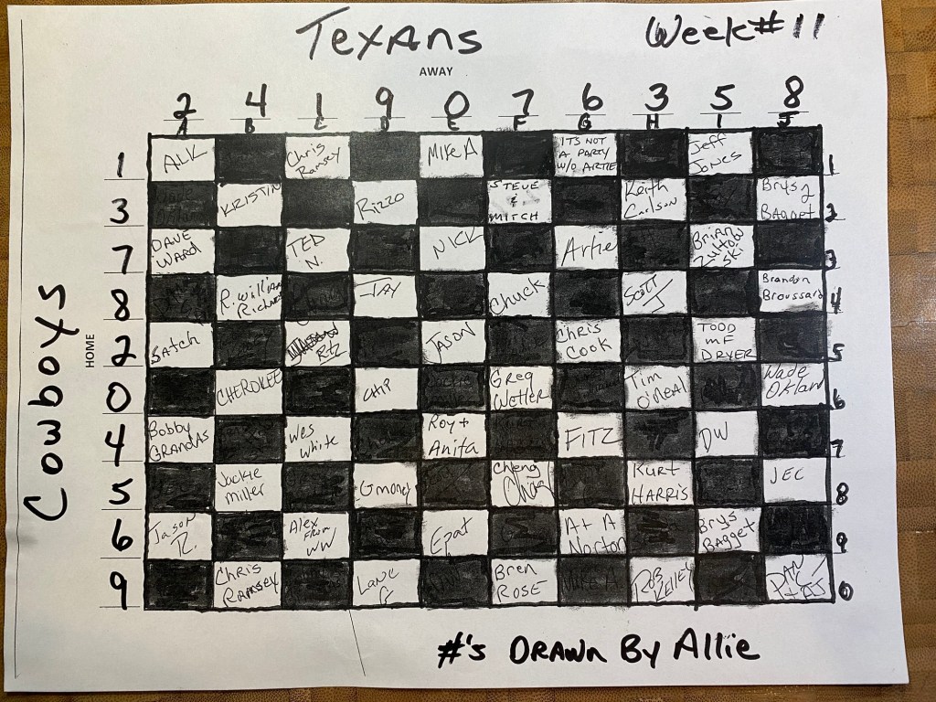 Texans 34 vs. Dallas 10- 1 box of ziti in play – we have a winner ! Congrats to Cherokee!