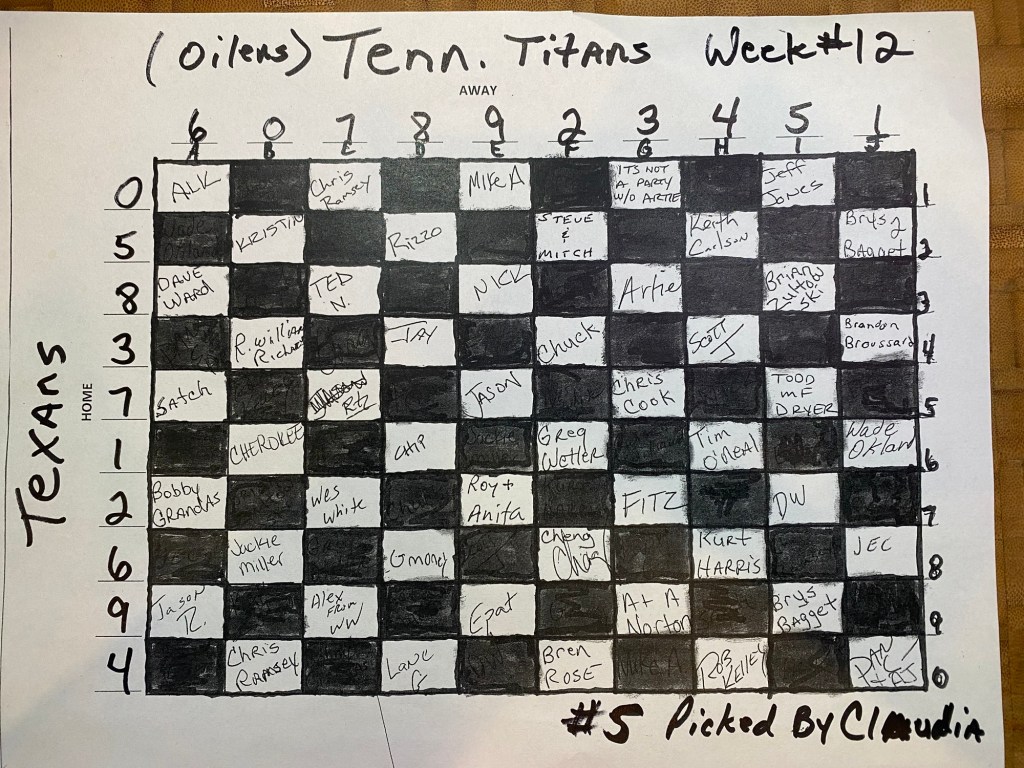 Titans 32 vs. Texans 27- 1 box of ziti in play – no winner, we have a rollover