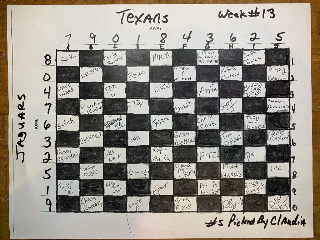 Texans 23 vs. Jaguars 20 – 2 boxes of ziti in play – no winner, we have another rollover – remember, next week is a bye week , we have the Monday night Cowboys/Bengals game in play but the rollover pot is not in play for this game; it will be in play for the next Texans game.