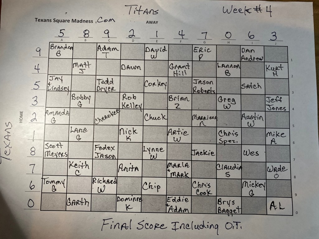 Titans 0 vs. Texans 26 – we have another rollover!! – 5 boxes of ziti in play next week