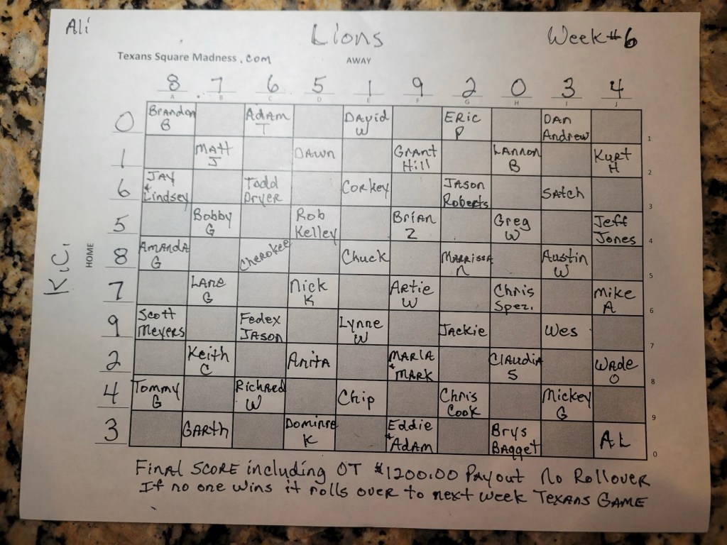 Lions 17at Chiefs 30 – no winner, this weeks game rolls over *** this is a bye week – bye week rules in effect – the rollover is not in play this week, it will be in play again next week for the next Texans game – if there is a winner this week, it will only pay the regular pot – if no winner then it will rollover into the next Texans game