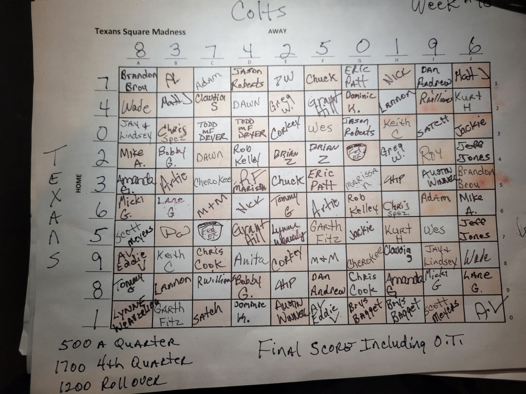 Final game of the season. All squares in play. $500 per quarter for first 3 quarters. Remaining pot plus rollover on final score.